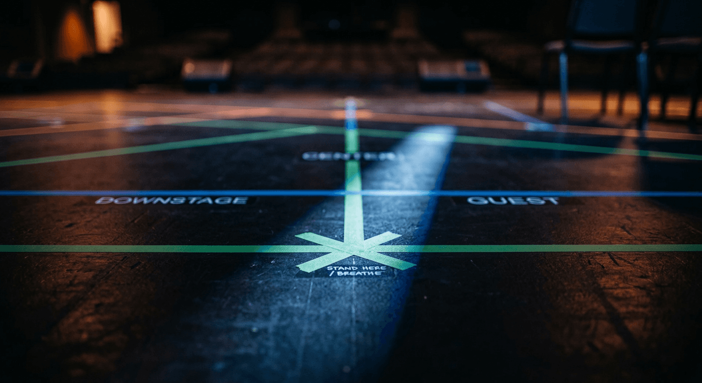 Instead of only using spike marks for exact positions, tape “zones” with labels: CENTER / DEMO / GUEST / DOWNSTAGE. It gives speakers a mental map, not a precision test. You can adjust camera framing and scenic realities without re-teaching the whole stage every time something shifts.