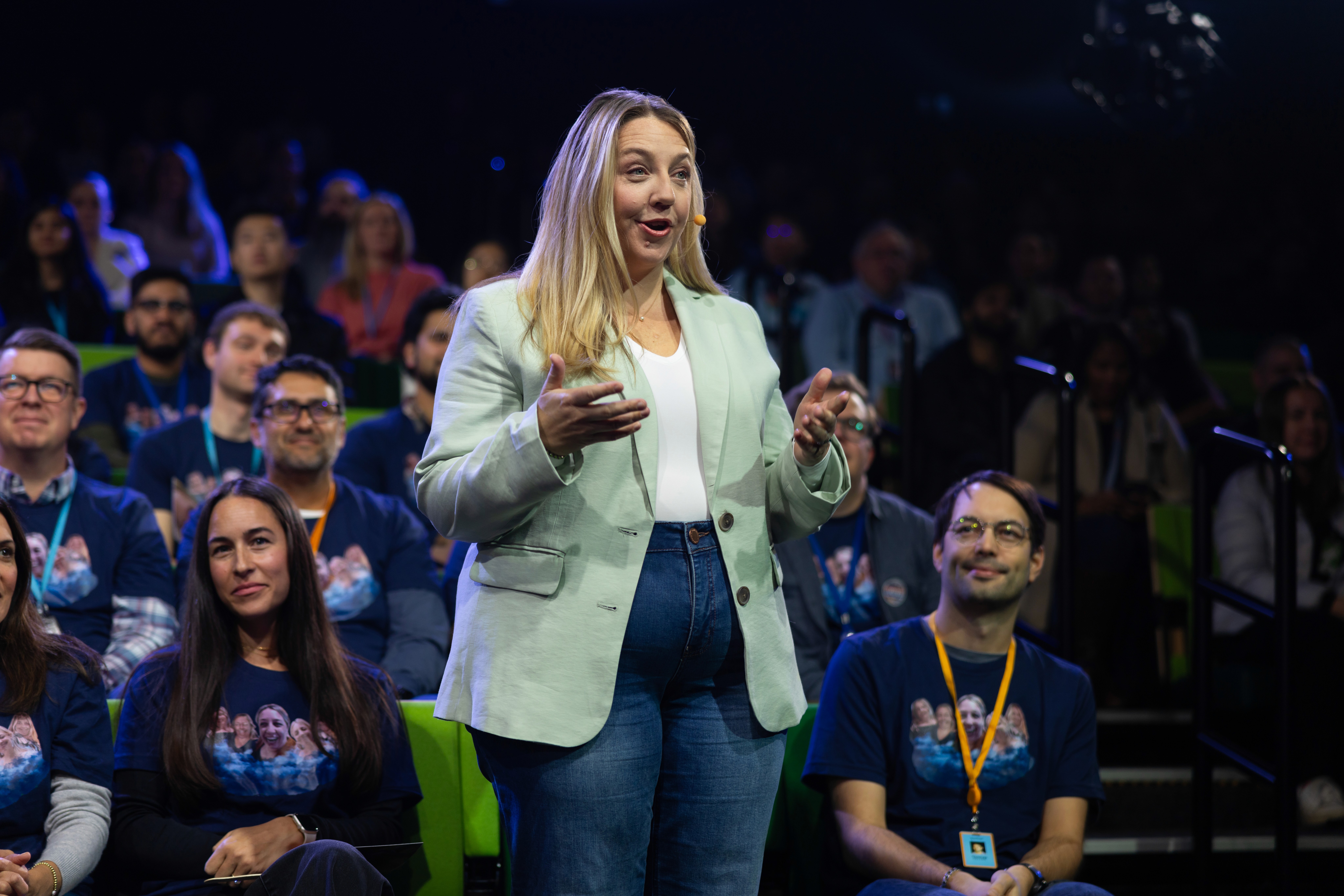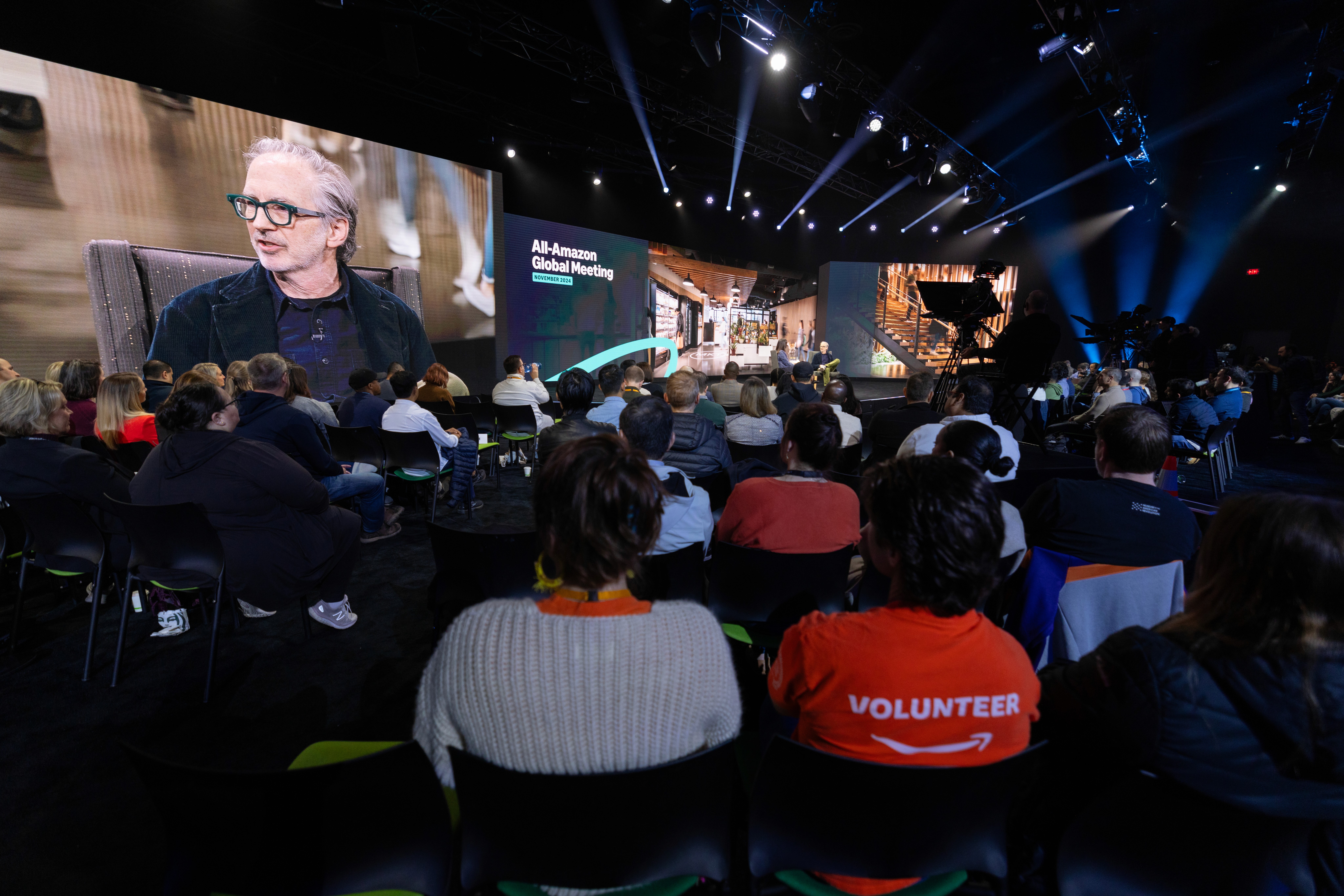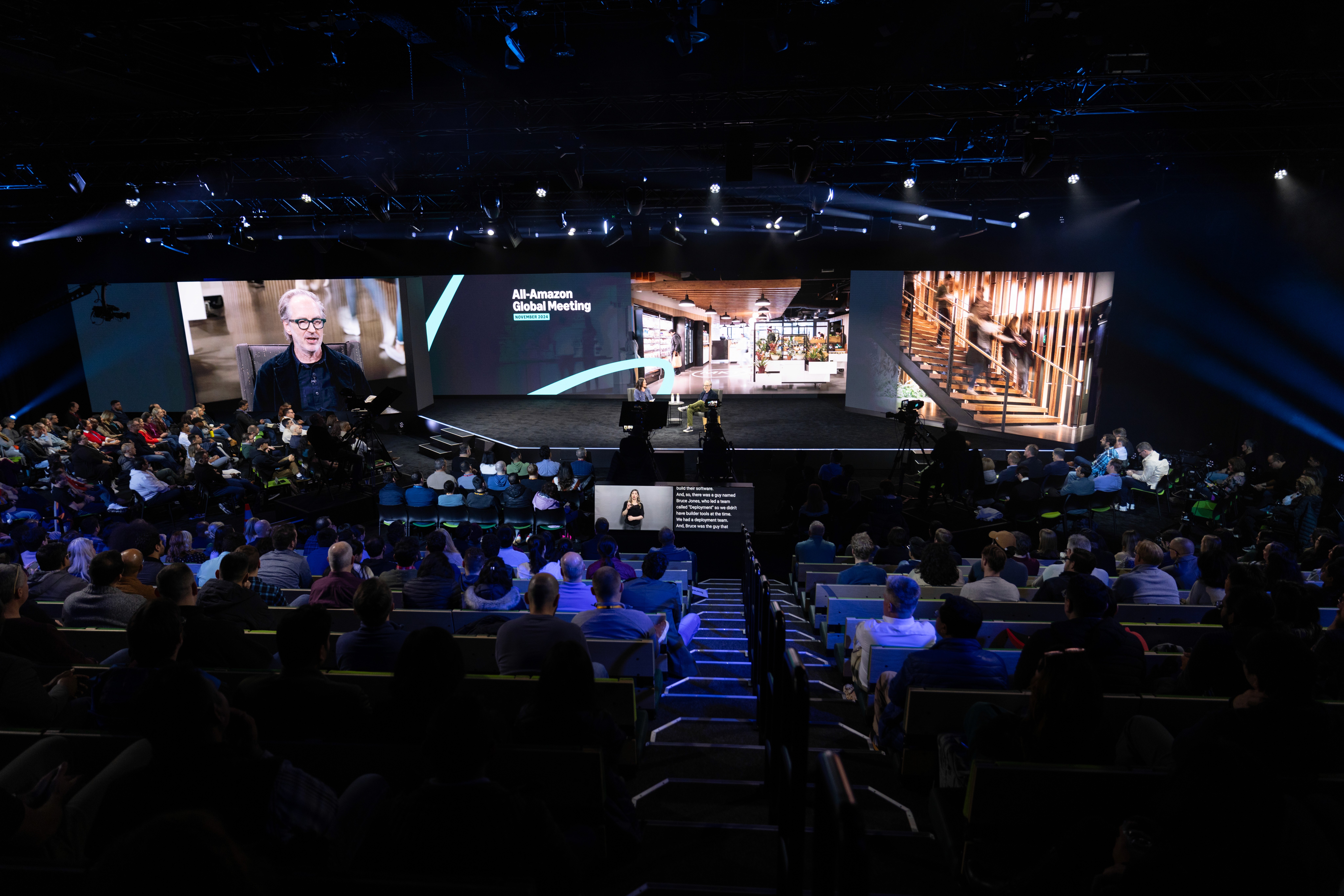 Staging with bold graphic treatments with playful typography and layered compositions that feel both polished and personal. Visual elements incorporate familiar domestic motifs reimagined at scale, transforming the venue into a shared living room for Amazon's global workforce. The opening moment builds emotional momentum through carefully choreographed media and original music composition, landing audiences in a collective sense of belonging.